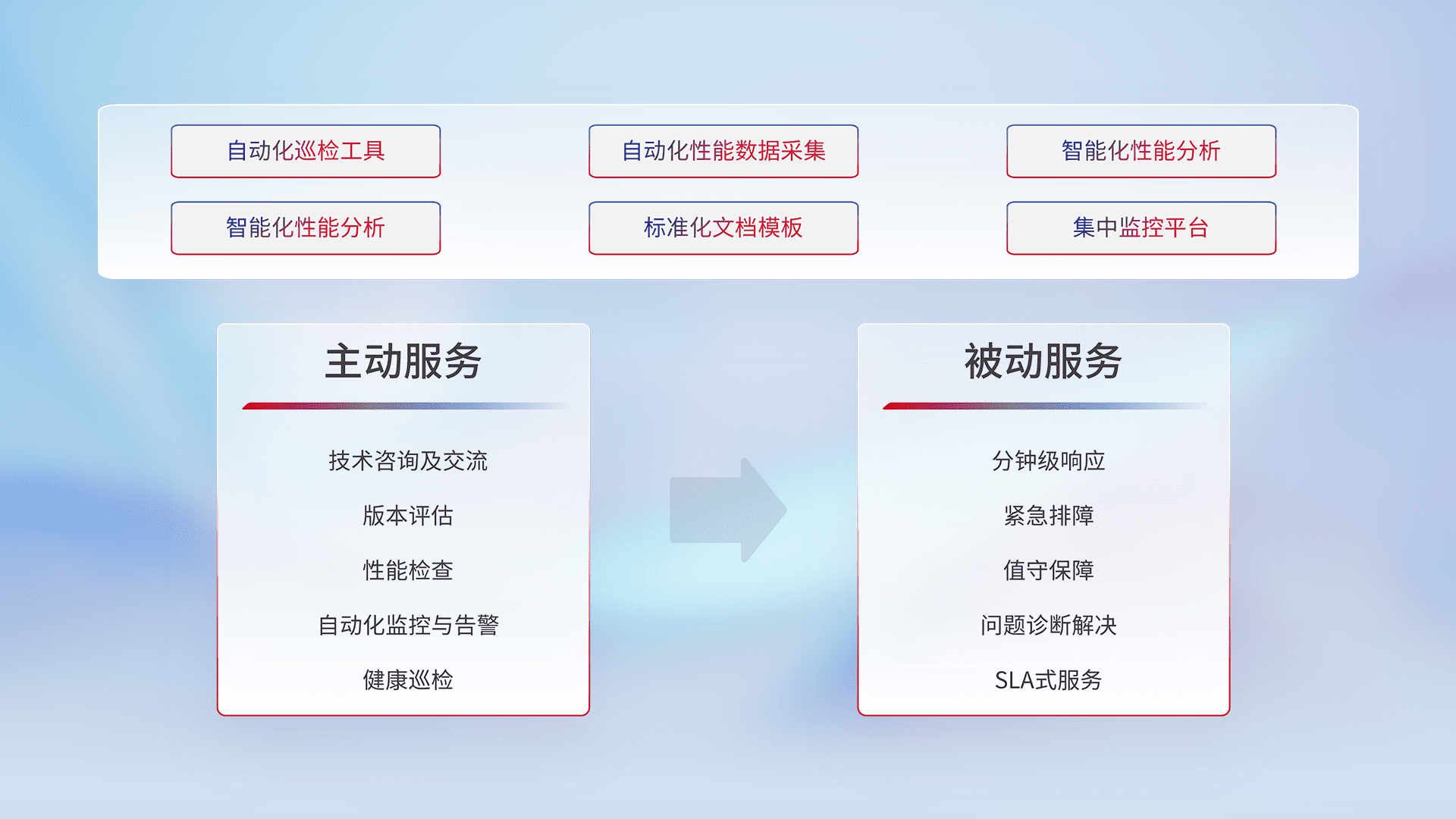 智能化工具和标准化文档,,,,保障服务质量,,提供主动服务(包含技术咨询、、、版本评估、、、性能检查、、、、自动化监控与告警、、、健康巡检)和被动服务包含(分钟级响应、、、、紧急排障、、值守保障、、、、问题诊断解决、、、SLA服务)。。。